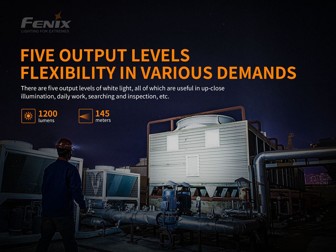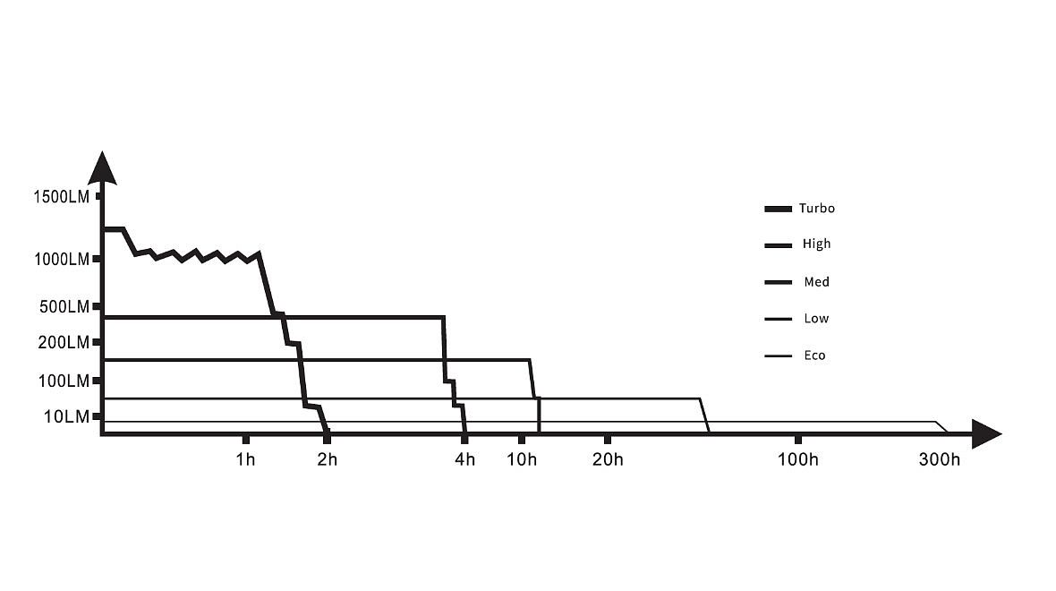 pět režimů bílého světla: 1600 lumenů (2 hodiny) -> 400 lumenů (4 hodiny) -> 150 lumenů (12 hodin) -> 50 lumenů (35 hodin) -> 5 lumenů (300 hodin)